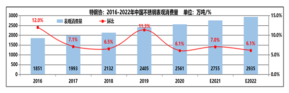 從當(dāng)前的產(chǎn)業(yè)數(shù)據(jù)來預(yù)判,2021年中國不銹鋼表觀消費(fèi)量將增長7.0%,達(dá)到2755萬噸,2022年需求基本盤與彈性盤雙弱,增長幅度回落至6.1%,預(yù)計(jì)中國不銹鋼表觀消費(fèi)量是2935萬噸。