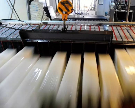 當(dāng)一塊塊重重的冰塊從制品生產(chǎn)線上運(yùn)出后,工人們能立刻感受到一股股撲面而來的冷氣,這種冷氣讓工人精神抖擻,他們熟練的操控著制冰機(jī)上方的不銹鋼電動葫蘆,利用電動葫蘆的吊鉤從冷凍池內(nèi)吊起一組冰桶,放在冷凍池前的清水里過幾遍,讓冰塊邊緣與冰桶之間的冰融化掉以保證冰塊順利滑出來,接著將冰塊倒在清水池前的空木板上。