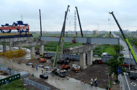 杭甬(杭州至寧波)高速公路復線寧波段一期濱海樞紐互通工程大規(guī)模、成批量架梁序幕正式拉開,在施工現(xiàn)場,兩臺履帶吊合力將重達20噸、長20米的鋼箱梁緩緩降落在兩座橋墩間,并將其平穩(wěn)地安放在濱?;ネ℅匝道東西兩座橋墩上。